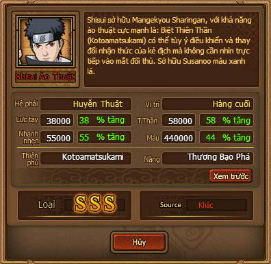 Thiên phú: Tăng % siêu lớn Nhạy Bén và Lực Tay, sinh ra có 153% Tốc độ, 390% tỉ lệ Sát thương, 390% tỉ lệ Miễn thương, 39% tỉ lệ phá kích, 39% tỉ lệ chính xác, 39% tỉ lệ bạo kích. Lúc Ninja lên trận, giảm toàn quân địch 35% tốc độ, tăng hàng đầu 150% trừ giảm thủ, tăng hàng giữa 150% trừ giảm công địch, tăng hàng sau 150% giảm thủ địch, tăng toàn quân ta 220% tỉ lệ khống chế địch, giúp đồng đội bỏ qua 220% tỉ lệ khống chế địch, bản thân bỏ qua 260% tỉ lệ khống chế địch, tăng toàn quân ta 150% tỉ lệ miễn thương, tăng toàn quân ta 90% trừ giảm thủ địch, giảm hàng giữa và sau địch 120% tỉ lệ hợp kích, giảm toàn quân địch 50% công kích. Bản thân có trạng thái Susanoo (giúp bản thân càng ít máu chỉ số tấn công cao hơn và các chỉ số phòng thủ cao hơn). Sau khi chết hồi sinh với 10% máu và xóa bỏ mọi trạng thái bất lợi, có lợi, khống chế cho bản thân (1 lần hồi sinh). Miễn dịch Tử Vong Chủng, Băng Phong và Mù.
