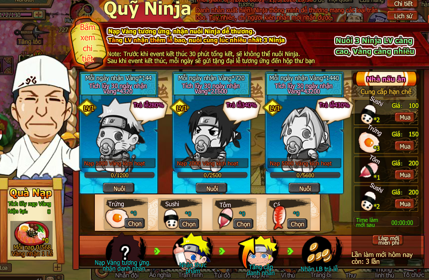 Trứng: nhận 5 Exp, giá 50 Vàng; Sushi: nhận 10 Exp, giá 100 Vàng; Tôm: nhận 20 Exp, giá 200 Vàng; Cá: nhận 40 Exp, giá 400 Vàng; - Mỗi nạp 1000 Vàng, nhận 1 LB nạp thực phẩm, có thể lặp lại nhận.