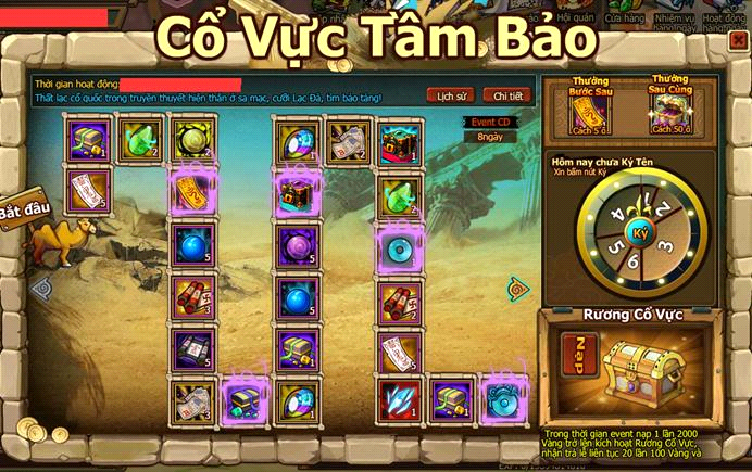 Nội dung hoạt động: Kho Báu có 2 cách chơi rút thăm may mắn và rút thăm Vàng, đồng thời rút thăm nhận được điểm may mắn, khi điểm may mắn tích lũy đến số lượng nhất định có thể tiến hành rút thăm Bí Bảo.