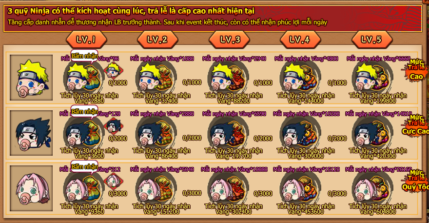 Giữ tăng trả lễ cả 3 quỹ Naruto-Sasuke-Sakura. Nhận tối đa 3 quỹ tổng: 1.224.900 vàng