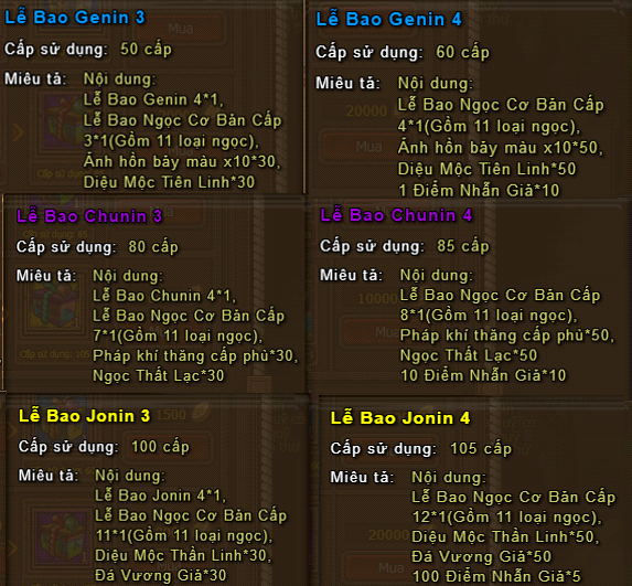 - Mì đặc biệt: Mảnh Trang Sức Bậc D, C, B, A, S, SS, SSS, Chakra-Sơ, Trung, Cao, Thượng, Kage, Huyền Thoại