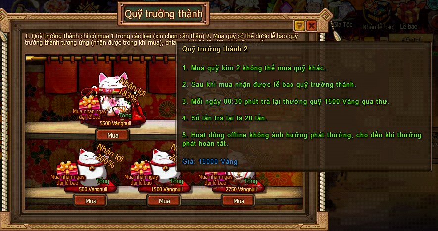 - Tổng có 3 loại quỹ Vàng, mỗi loại trả lễ khác nhau, có thể nuôi 3 Ninja.