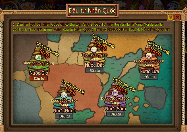 - Theo tuần tự mở cơ hội đầu tư nhẫn quốc (Tuần tự: Phong→Thủy→Thổ→Lôi→Hỏa)