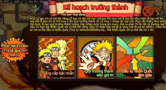 - Người chơi nạp Vàng, kích hoạt quỹ ninja: kích hoạt Naruto cần nạp 1000 Vàng, kích hoạt Sasuke cần nạp 2000 Vàng, kích hoạt Sakura cần nạp 4000 Vàng.