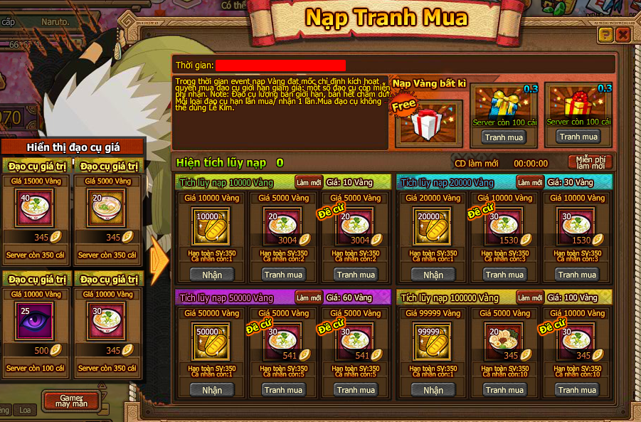- Trong thời gian event nạp Vàng đạt mốc chỉ định kích hoạt quyền mua đạo cụ giới hạn giảm giá, một số đạo cụ còn miễn phí nhận.