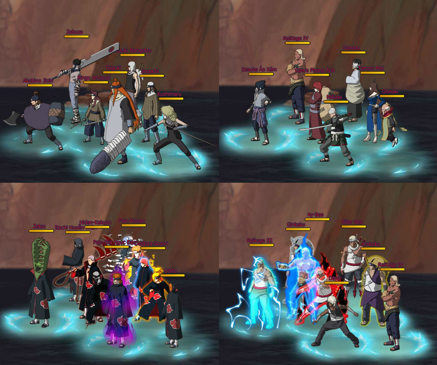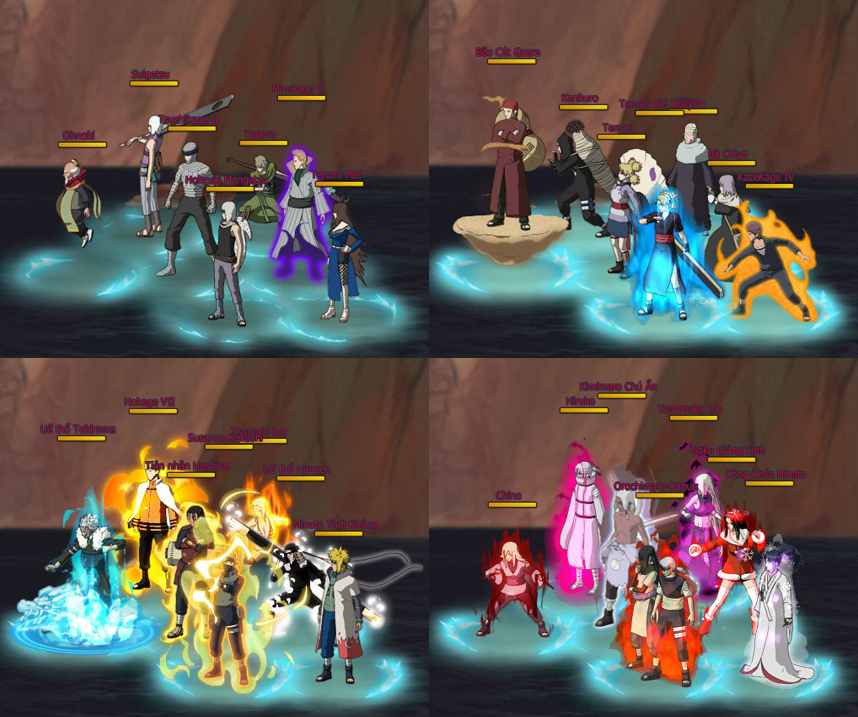 Tất cả các ải: ải 1 – Chuyển Sinh Thất Ảnh, ải 2 – Hội Nghị Ngũ Kage, ải 3 – Chuyển Sinh Akatsuki, ải 4 – Làng Mây, ải 5 – Làng Đá, Làng Sương Mù, ải 6 – Làng Cát, ải 7 – Hokage, ải 8 – Huyết Kế Giới Hạn.