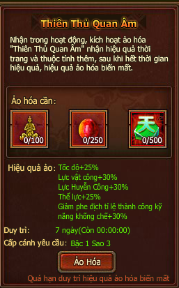 Nguyên liệu ảo hoá: 100 Quan Âm Thủ, 250 Xá Lợi Tử, 500 Đá Chấn Thiên.