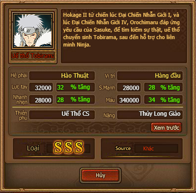 Thiên phú: Tăng % siêu lớn Nhạy Bén và Lực tay, sinh ra có 90% Tốc độ, 70% tỉ lệ Sát thương, 55% tỉ lệ Miễn thương. Lúc Ninja lên trận, tăng toàn quân ta 102% tốc độ và 30% tỉ lệ sát thương, giảm sát thương cuối của kẻ địch lên hàng giữa và hàng sau ta 30%, giảm phe địch 30% công kích, tăng bản thân 40% công kích và 30% tỉ lệ miễn thương, mỗi giảm 10% máu tăng 20% tỉ lệ sát thương. Sau khi bị tấn công có 50% tỉ lệ xoá hiệu ứng tiêu cực cho bản thân, bị tấn công tăng bản thân 50% tốc độ trong 1 lượt. Bản thân bỏ qua 80% tỉ lệ khống chế địch. Miễn dịch Mù, Băng Phong và Tử Vong Chủng. (2 CS kích hoạt thiên phú ẩn)