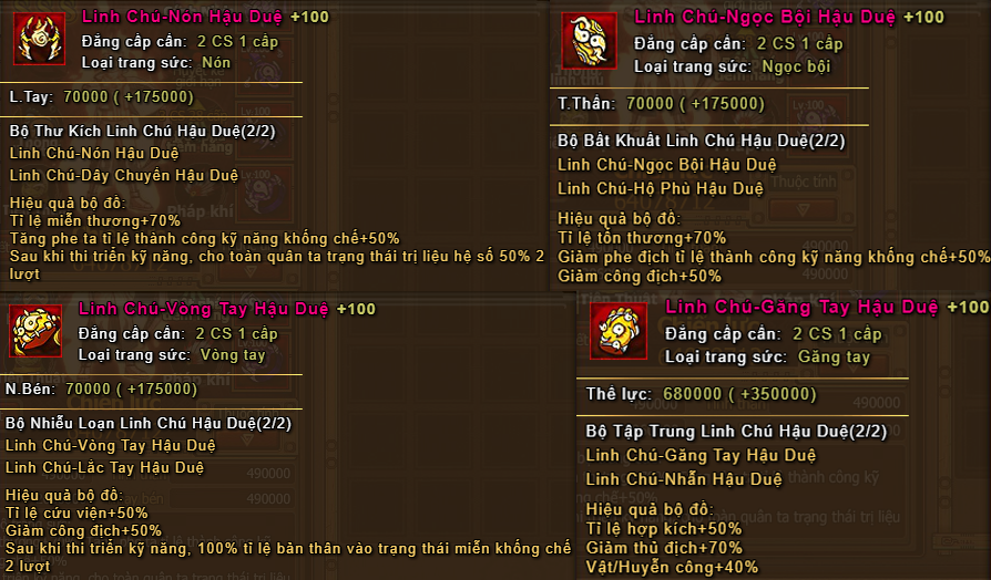 Tính năng linh chú: dùng để linh chú trang sức Hậu Huệ, cần 4 loại nguyên liệu để linh chú. Thuộc tính trang sức Hậu Duệ được tăng thêm % chỉ số và điểm thuộc tính cơ bản và được thêm 1 dòng thuộc tính đặc biệt ở mỗi cặp.