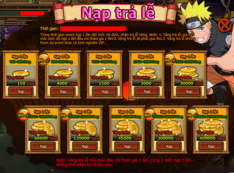 - Trong thời gian event nạp 1 lần đạt mức chỉ định, nhận Vàng trả lễ.