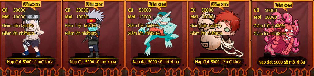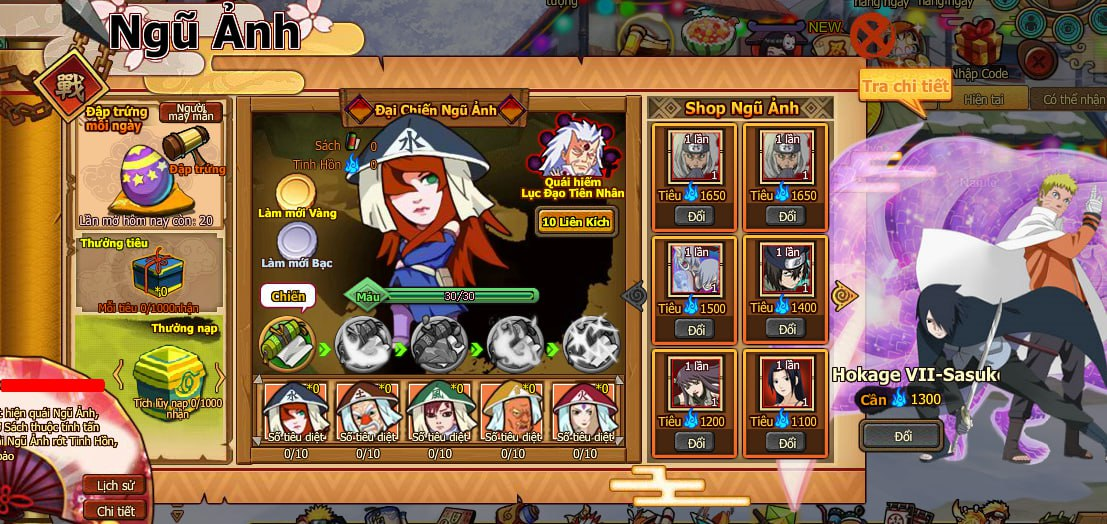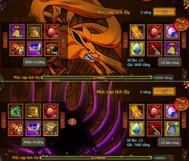 - Liên SV thu thập Huyết Kế đạt 20, và người chơi nạp và nhận tùy ý 1 mốc, sẽ nhận LB Tộc Otsutsuki.