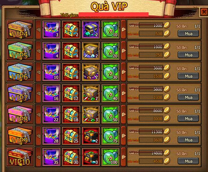 - Trong thời gian event, người chơi đẳng cấp VIP≥4 dùng Vàng hoăc lễ kim mua lễ bao VIP, nhận lượng lớn item, đạo cụ hiếm.