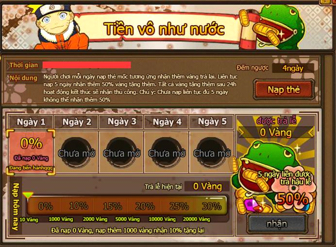 - 2. Liên tục 5 ngày đều nạp thẻ, có thể nhận được thêm 50% tổng giá trị nạp;