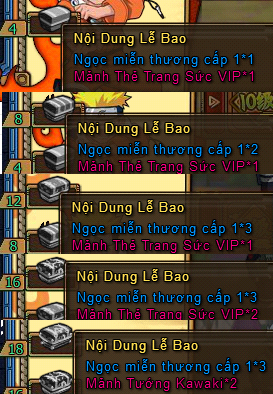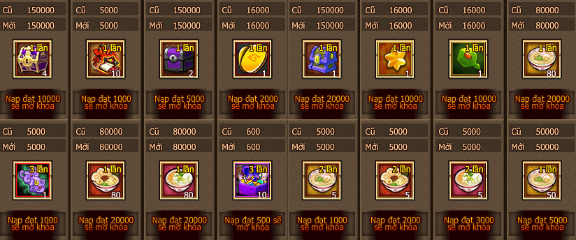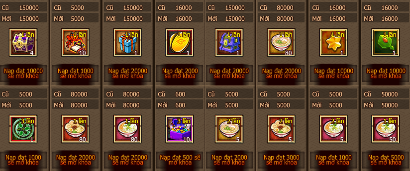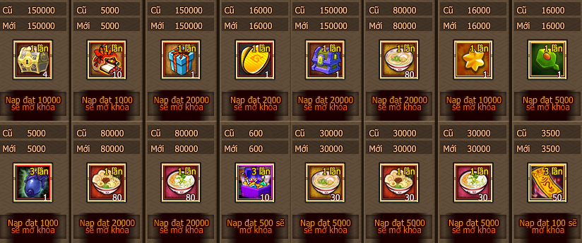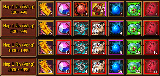 - Vàng trả lễ của mỗi mốc mức độ nạp 1 lần đều chỉ tham gia 1 lần!