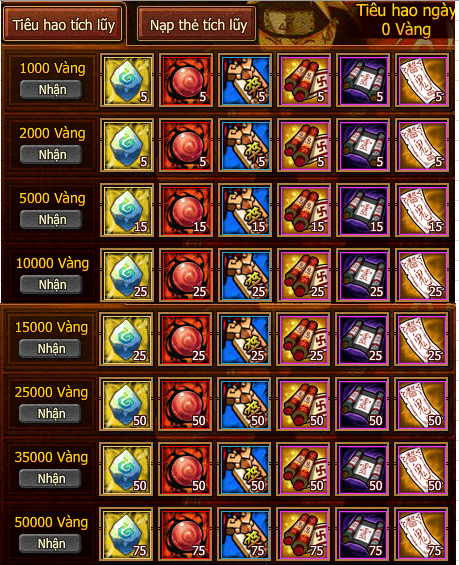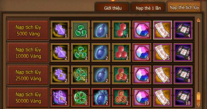 - Tích lũy nạp đạt 50000 Vàng, nhận đại lễ bao tích lũy nạp.