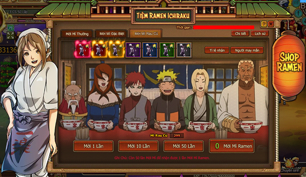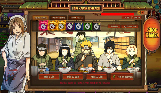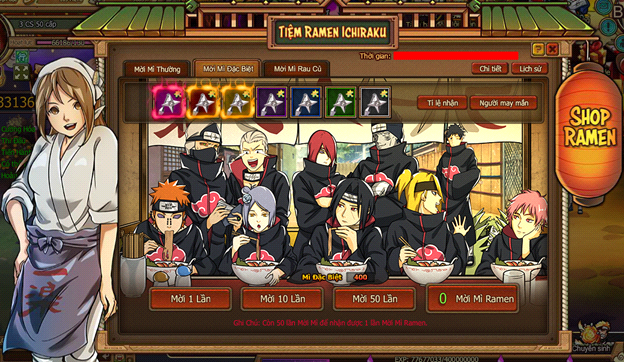 - Trong thời gian hoạt động, người chơi tiêu 3 loại Mì để mời các Ninja ăn. Có thể mời 1 lần, 10 lần và 50 lần. Mời mì nhận vật phẩm tương ứng mỗi loại mì.