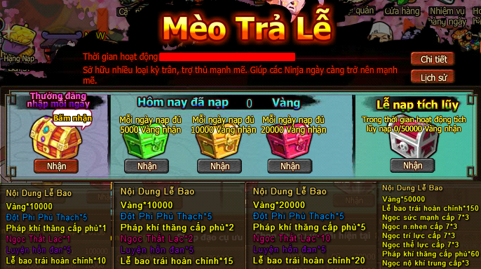 Nội dung hoạt động: Trong thời gian hoạt động người chơi tiến hành nạp thẻ, sẽ nhận được Vàng trả lễ. Nạp càng nhiều, trả lễ càng phong phú.