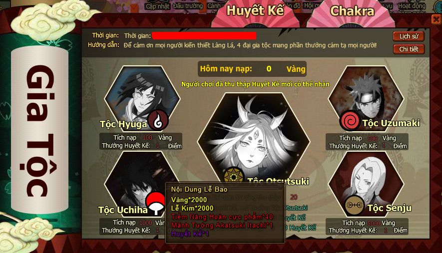- Trong thời gian hoạt động mỗi ngày tích lũy nạp đủ mốc tương ứng, mở 4 đại gia tộc, nhận thưởng Huyết Kế tương ứng. 4 đại gia tộc gồm: Tộc Hyuga, Tộc Uzumaki, Tộc Uchiha, Tộc Senju.
