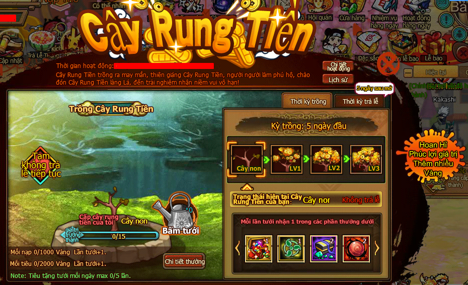 - Trả lễ Cây Rung Tiền chia làm 5 ngày phát, cần người chơi mỗi ngày online chủ động nhận, bỏ lỡ thời gian không đền bù, xin chú ý online kịp thời nhận thưởng.