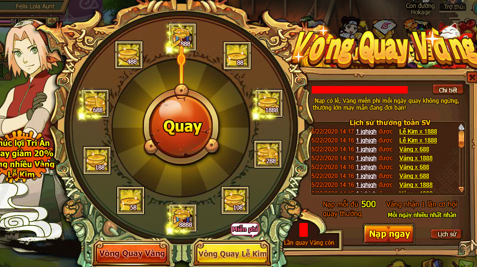- Trong thời gian, người chơi nạp đủ 500 Vàng nhận 1 lần cơ hội quay Vòng quay Vàng, mỗi ngày nhiều nhất có thể nhận 20 lần;