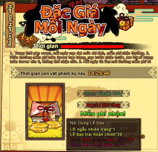 - Phần thưởng miễn phí toàn Server hạn lượng, nạp trước nhận trước, sau khi số lượng toàn Server còn 0, không thể nhận nữa.