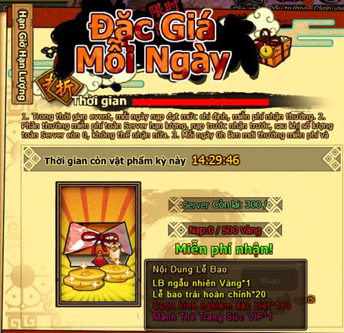 - Trong thời gian event, mỗi ngày nạp đạt mức chỉ định, miễn phí nhận thưởng.