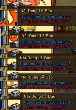 Trong thời gian event, người chơi đẳng cấp VIP≥4 dùng Vàng hoăc lễ kim mua lễ bao VIP, nhận lượng lớn item, đạo cụ hiếm.