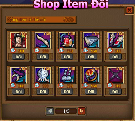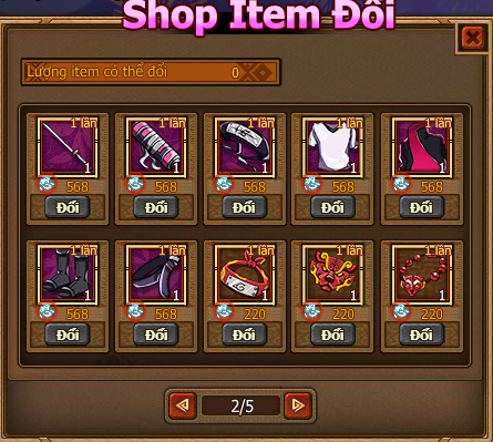 - Shop đổi: các vật phẩm hiếm như Ryo, Trang sức trống, Trang bị trống,…