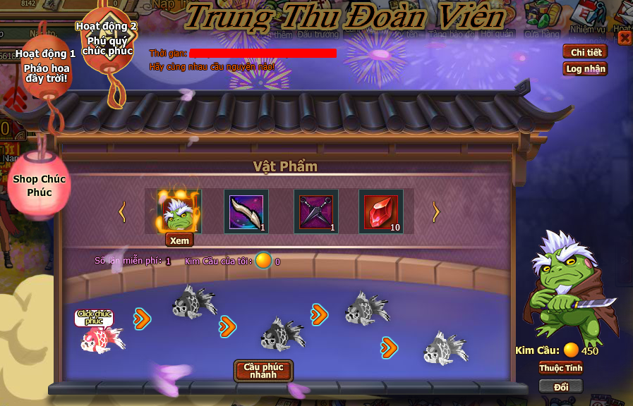 - Mỗi lần click Cá chúc phúc tiêu 200 vàng, có tỉ lệ thành công tăng lên Cá chúc phúc kế tiếp. Mỗi Cá chúc phúc nhận lượng Kim Cầu khác nhau, tương ứng là 1-2-3-4-5 Kim Cầu cho 5 Cá chúc phúc.