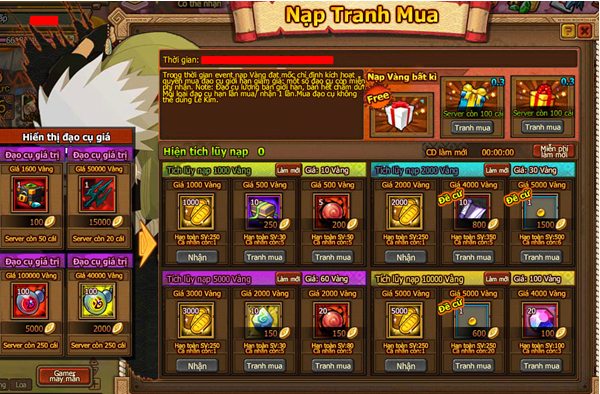 Trong thời gian event nạp Vàng đạt mốc chỉ định kích hoạt quyền mua đạo cụ giới hạn giảm giá, một số đạo cụ còn miễn phí nhận.