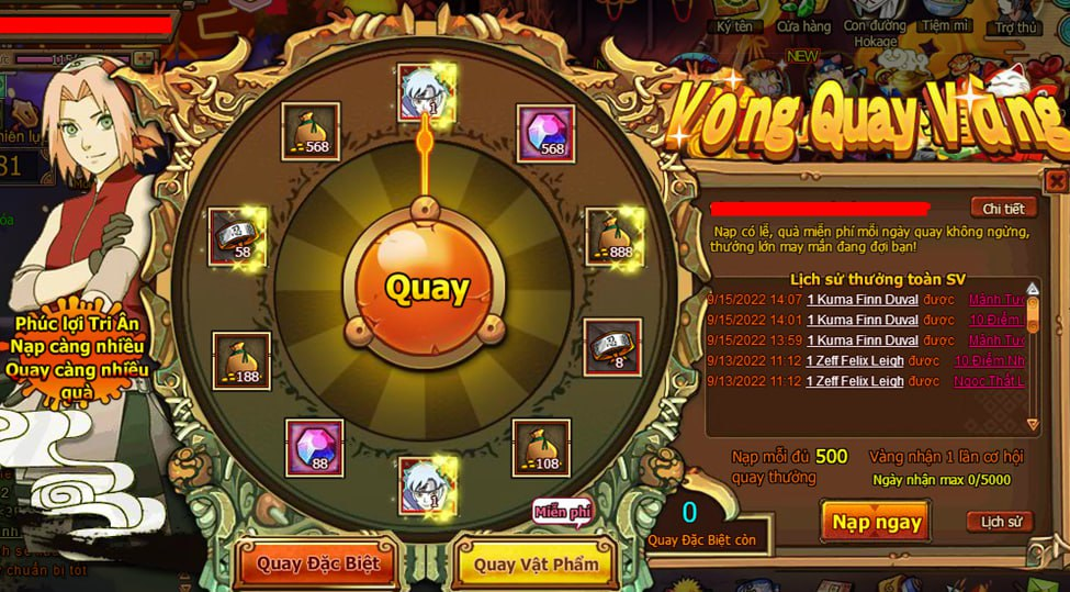 1. Trong thời gian,người chơi nạp đủ 500 Vàng nhận 1 lần cơ hội quay Vòng quay Vàng, mỗi ngày nhiều nhất có thể nhận 20 lần.
