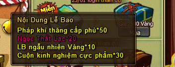 - Tích lũy nạp đạt 50000 Vàng, nhận đại lễ bao tích lũy nạp.