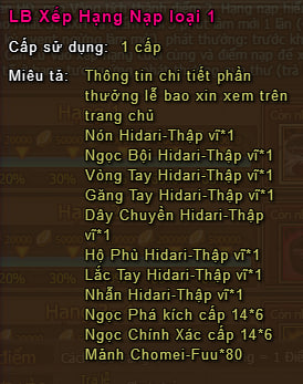 - Trong thời gian event nạp 1 lần đạt mức chỉ định, nhận Vàng trả lễ.