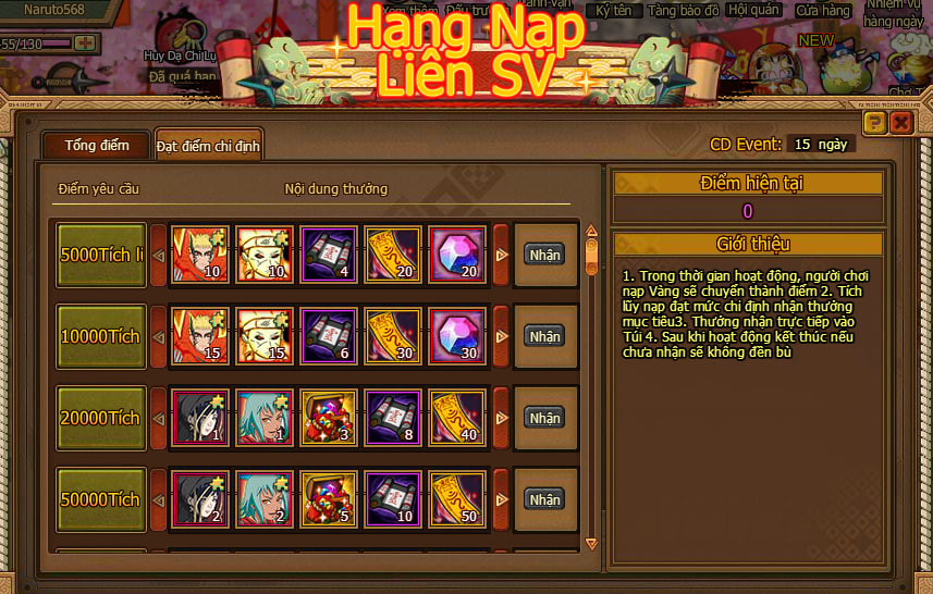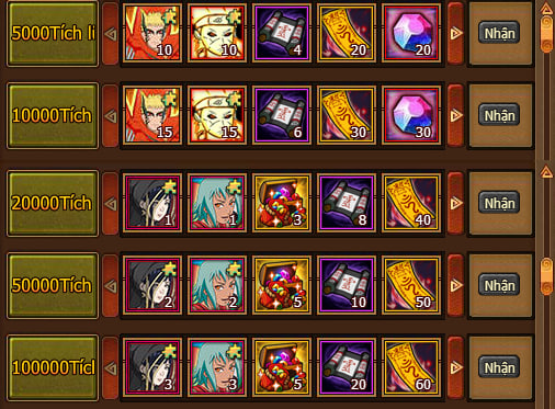 - Liên SV thu thập Huyết Kế đạt 20, và người chơi nạp và nhận tùy ý 1 mốc, sẽ nhận LB Tộc Otsutsuki.