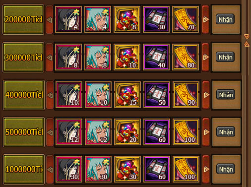 - Vàng trả lễ của mỗi mốc mức độ nạp 1 lần đều chỉ tham gia 1 lần!