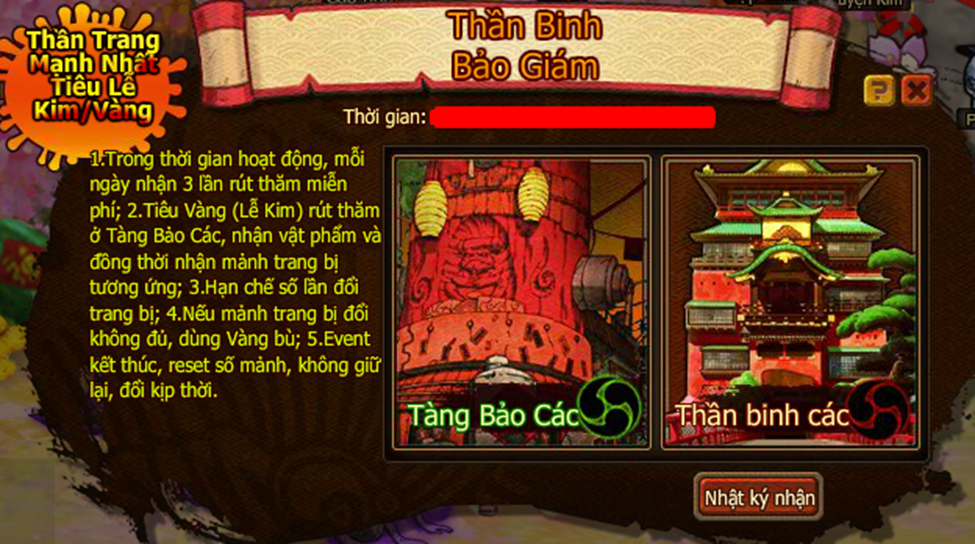 2.Tiêu Vàng (Lễ Kim) rút thăm ở Tàng Bảo Các, nhận vật phẩm và đồng thời nhận mảnh trang bị tương ứng.