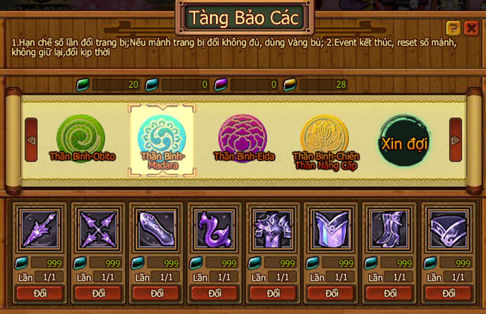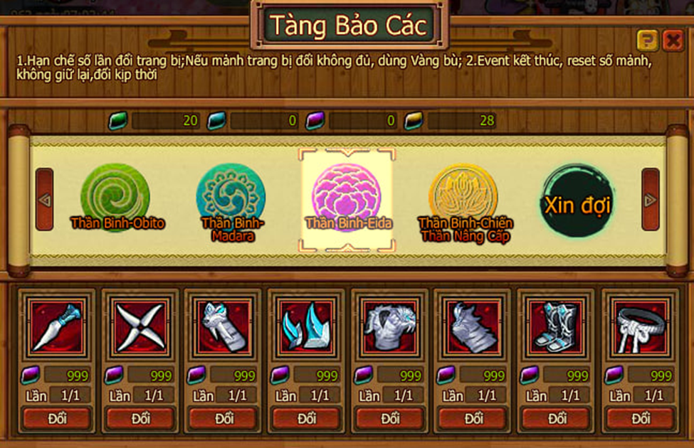 - Shop đổi: các vật phẩm hiếm như Ryo, Trang sức trống, Trang bị trống,…