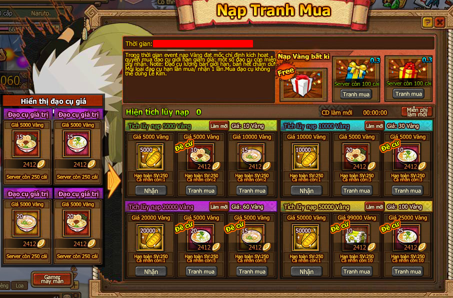 Trong thời gian event nạp Vàng đạt mốc chỉ định kích hoạt quyền mua đạo cụ giới hạn giảm giá, một số đạo cụ còn miễn phí nhận.