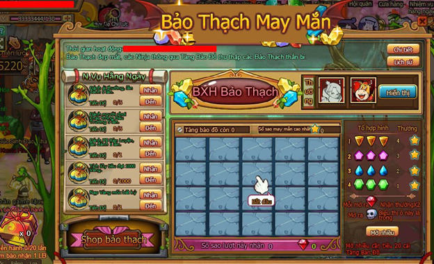 Lưu ý: Ghi nhận xếp hạng Bảo Thạch là số Sao May Mắn cao nhất, ở shop bảo thạch dùng Sao May Mắn để đổi đạo cụ không ảnh hưởng ghi nhận số Sao May Mắn cao nhất.