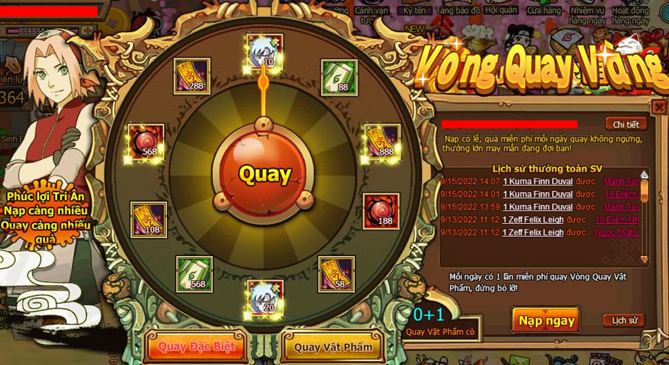 - Trong thời gian,người chơi nạp đủ 500 Vàng nhận 1 lần cơ hội quay Vòng Quay Đặc Biệt, mỗi ngày nhiều nhất có thể nhận 5000 lần.
