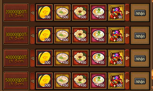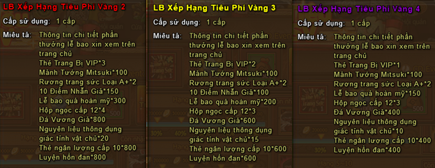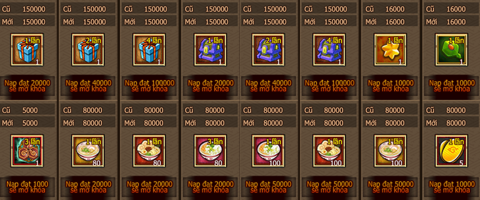 - Vàng trả lễ của mỗi mốc mức độ nạp 1 lần đều chỉ tham gia 1 lần!