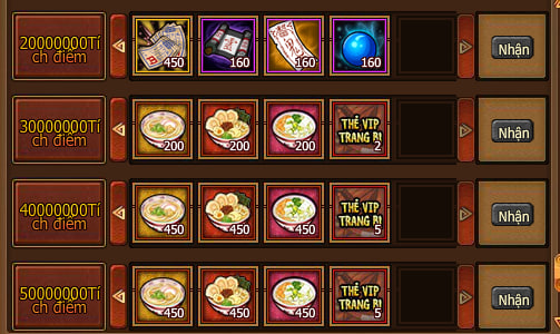 - Tích lũy nạp đạt 50000 Vàng, nhận đại lễ bao tích lũy nạp.