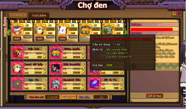 - Mì đặc biệt: Mảnh Trang Sức Bậc D,C,B,A,S,SS,SSS, Chakra-Sơ, Trung, Cao, Thượng, Kage, Huyền Thoại