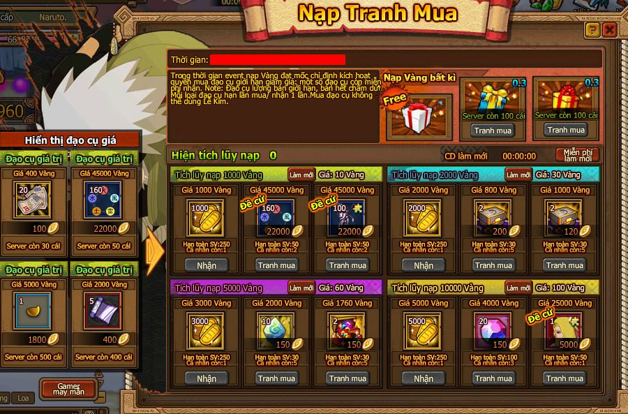 Trong thời gian event nạp Vàng đạt mốc chỉ định kích hoạt quyền mua đạo cụ giới hạn giảm giá, một số đạo cụ còn miễn phí nhận.
