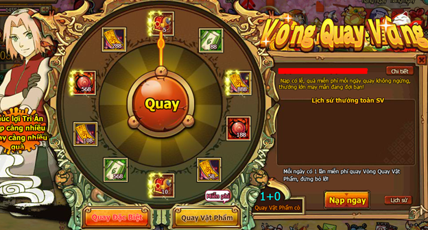 - Người chơi nạp Vàng, kích hoạt quỹ ninja: kích hoạt Naruto cần nạp 1000 Vàng, kích hoạt Sasuke cần nạp 2000 Vàng, kích hoạt Sakura cần nạp 4000 Vàng.