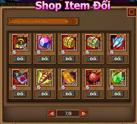 Trứng: nhận 5 Exp, giá 50 Vàng; Sushi: nhận 10 Exp, giá 100 Vàng; Tôm: nhận 20 Exp, giá 200 Vàng; Cá: nhận 40 Exp, giá 400 Vàng; - Mỗi nạp 1000 Vàng, nhận 1 LB nạp thực phẩm, có thể lặp lại nhận.