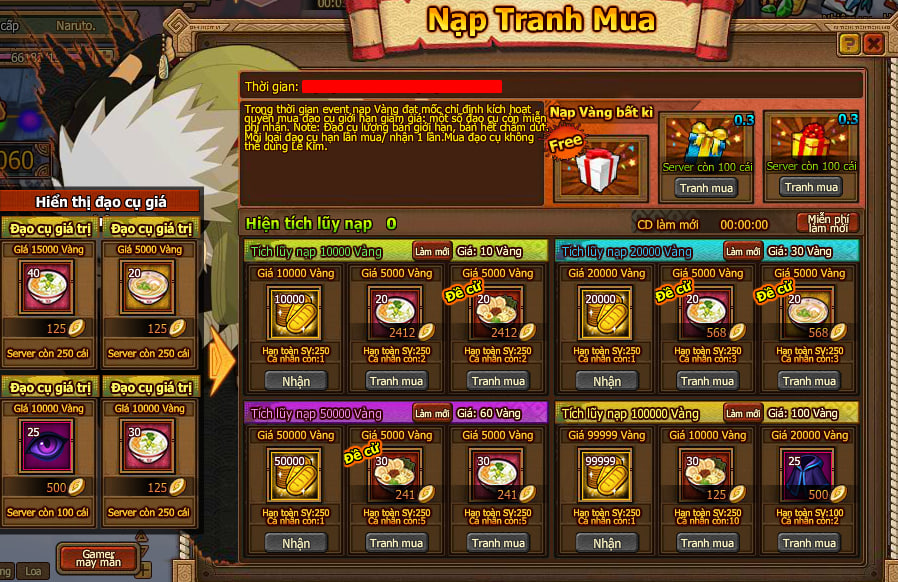 Tích lũy nạp mốc 100000 bán: Mì Thường, Mì Đặc Biệt, Mì Rau Củ tăng x2 số lượng mì + giảm vàng mua còn 125 vàng, Rương Chakra Bậc Cao Ngẫu Nhiên tăng x2 số lượng mua, Áo choàng bám chị và Mắt tử đoạn*25 (2 lần mua)
